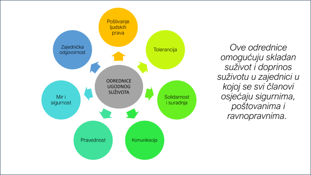 Odrednice ugodnog suživota uključuju poštivanje ljudskih prava, toleranciju, solidarnost i suradnju, komunikaciju, pravednost, mir i sigurnost te zajedničku odgovornost.